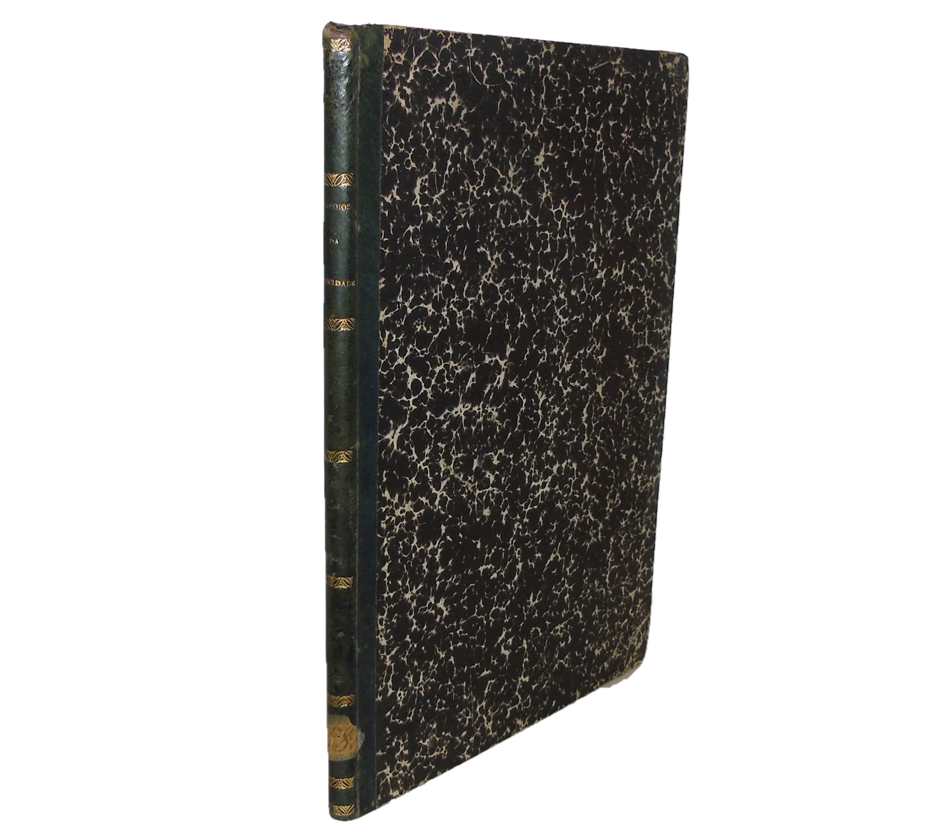 Nota: Exemplar com alguns picos e manchas de oxidação, com mais incidência nas folhas das guardas e na folha do rosto; encadernação algo cansada, com maior nota nas extremidades da lombada e das pastas.
