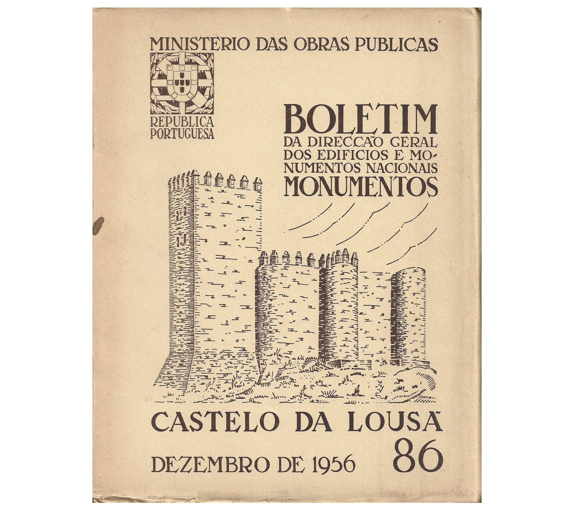 BOLETIM DA DIRECÇÃO GERAL DOS EDIFÍCIOS E MONUMENTOS NACIONAIS. N.º 86: CASTELO DA LOUSÃ. [LISBOA]: DIRECÇÃO GERAL DOS EDIFÍCIOS E MONUMENTOS NACIONAIS, 1956. (COMPOSIÇÃO E IMPRESSÃO DE GRAVURAS E TEXTO NAS OFICINAS DA «MARÂNUS» EMPRESA INDUSTRIAL GRÁFICA DO PORTO, L.DA). DE 26X20CM. COM 32 PÁGS. [TEXT] & 13 FLS. [ESTAMP], [11] FLS. DESD. PLANTAS. B.