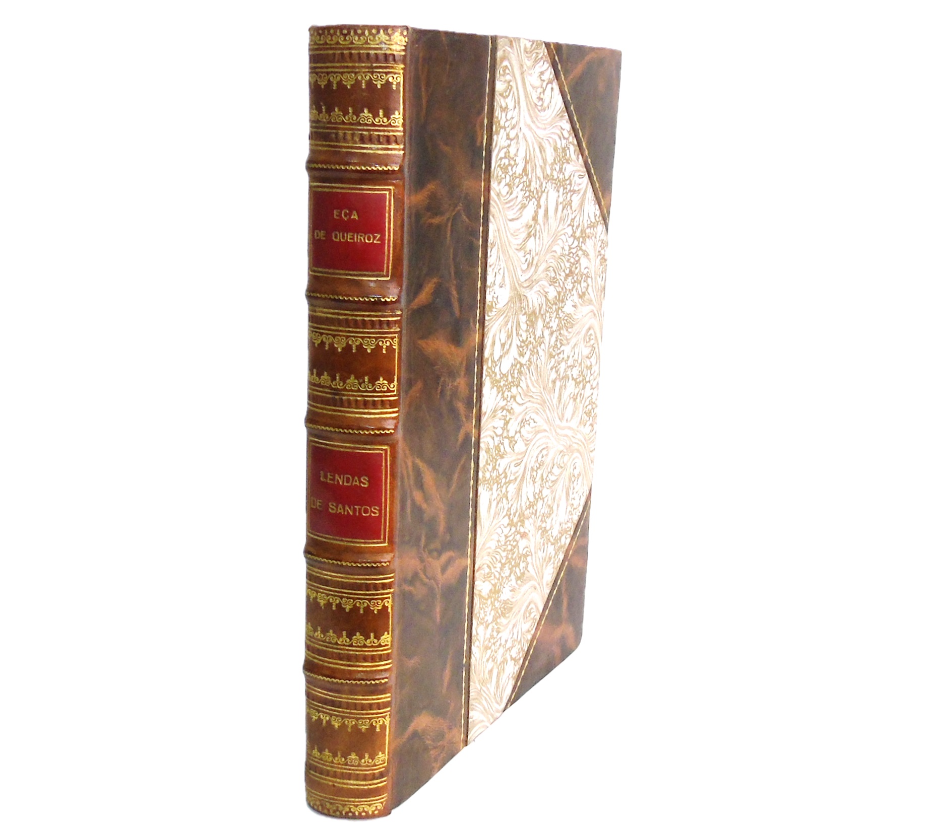 Boa encadernação com a lombada e cantos em pele, decorada com artísticos ferros a ouro, rótulos e nervos na lombada; corte da cabeça carminado; por aparar nos restantes cortes e com as capas e lombada conservadas. [miolo amarelecido; corte das fls. mais escurecidos; acidez na folha de anterrosto e nas finais]