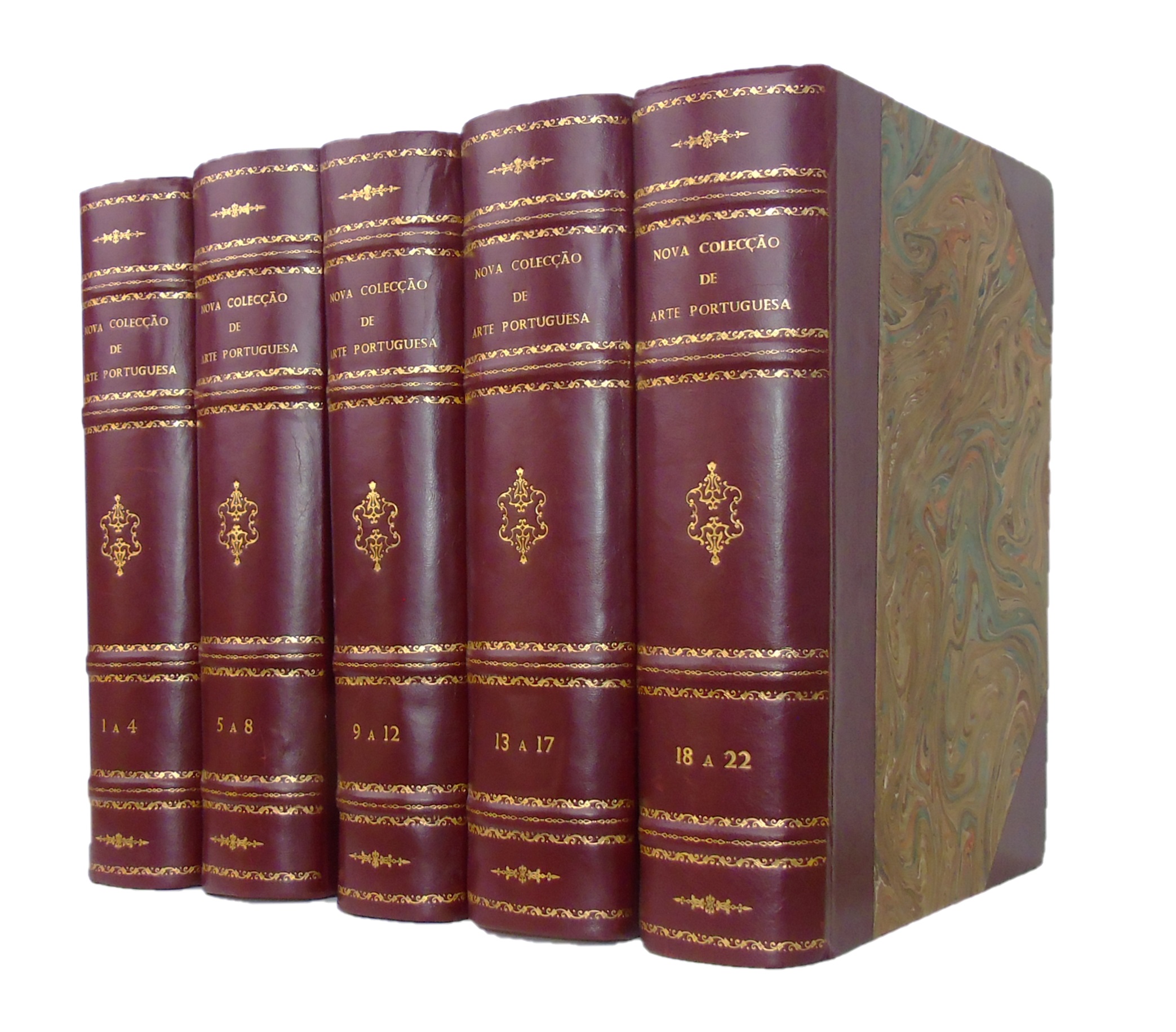 Série de monografias e estudos críticos dedicados à análise de artistas e movimentos significativos da arte portuguesa. Cada volume propõe uma leitura histórica e estética das obras, situando-as nos contextos socioculturais e artísticos do período. Os volumes integram ilustrações rigorosamente selecionadas, reproduzindo pinturas, desenhos e esculturas, permitindo ao leitor um contacto visual direto com as obras analisadas. A coleção visava documentar e divulgar a produção artística nacional, constituindo-se ainda hoje como um instrumento válido e rigoroso que contribui para a compreensão crítica e sistemática da evolução e da diversidade da arte portuguesa.Coleção organizada da seguinte forma: 1 - Gregório Lopes, por Luís Reis-Santos; 2 - Primitivos Portugueses do Museu de Setúbal, por Armando Viera Santos; 3 - Diogo Teixeira e seus Colaboradores, por Adriano de Gusmão; 4 - A Oficina de Frei Carlos, por João Couto; 5 - Josefa d’Óbidos, por Luís Reis-Santos; 6 - Vieira Lusitano, por Julieta Ferrão; 7 - Francisco Franco, por Diogo de Macedo; 8 - Simão Rodrigues e seus Colaboradores, por Adriano de Gusmão; 9 - Garcia Fernandes, por Luís Reis-Santos; 10 - Mestres Desconhecidos do Museu Nacional de Arte Antiga, por Adriano de Gusmão; 11 - Nuno Gonçalves, por Adriano de Gusmão; 12 - O Retábulo da Igreja do Paraíso, por Armando Vieira Santos; 13 - O Retábulo Quinhentista de Santos-o-Novo, por João Couto; 14 - Diogo de Macedo, por Manuel Mendes; 15 - Escola do Mestre de Sardoal, por Myron Malkiel-Jirmounsky; 16 - Cristovão de Figueiredo, por Luís Reis-Santos; 17 - O Mestre da Madre de Deus, por Adriano de Gusmão; 18 - Vasco Fernandes, por Luís Reis-Santos; 19 - O Mestre da Lourinhã; 20 - O Retábulo de Santiago,por Flávio Gonçalves; 21 - Jorge Afons, por Luís Reis-Santos; 22 - Eduardo, o Português, por Luís Reis-Santos.Fascículos encadernados em cinco espessos volumes, em meia de pele com cantos, decorados na lombada com nervos e ferros a ouro; capas de todos os fascículos conservadas. Exemplar muito limpo e bem conservado.