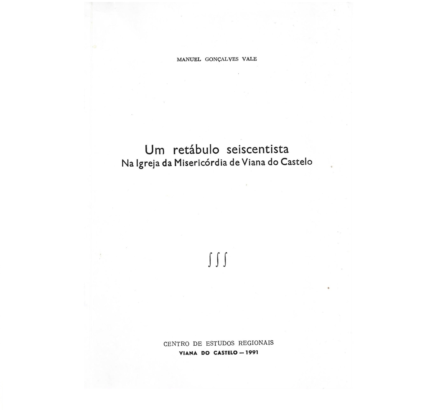 VALES, MANUEL GONÇALVES (1991) UM RETÁBULO SEISCENTISTA NA IGREJA DA MISERICÓRDIA DE VIANA DO CASTELO. VIANA DO CASTELO: CENTRO DE ESTUDOS REGIONAIS. DE 24X16 CM. COM 9 PÁGS. ILUST. B.