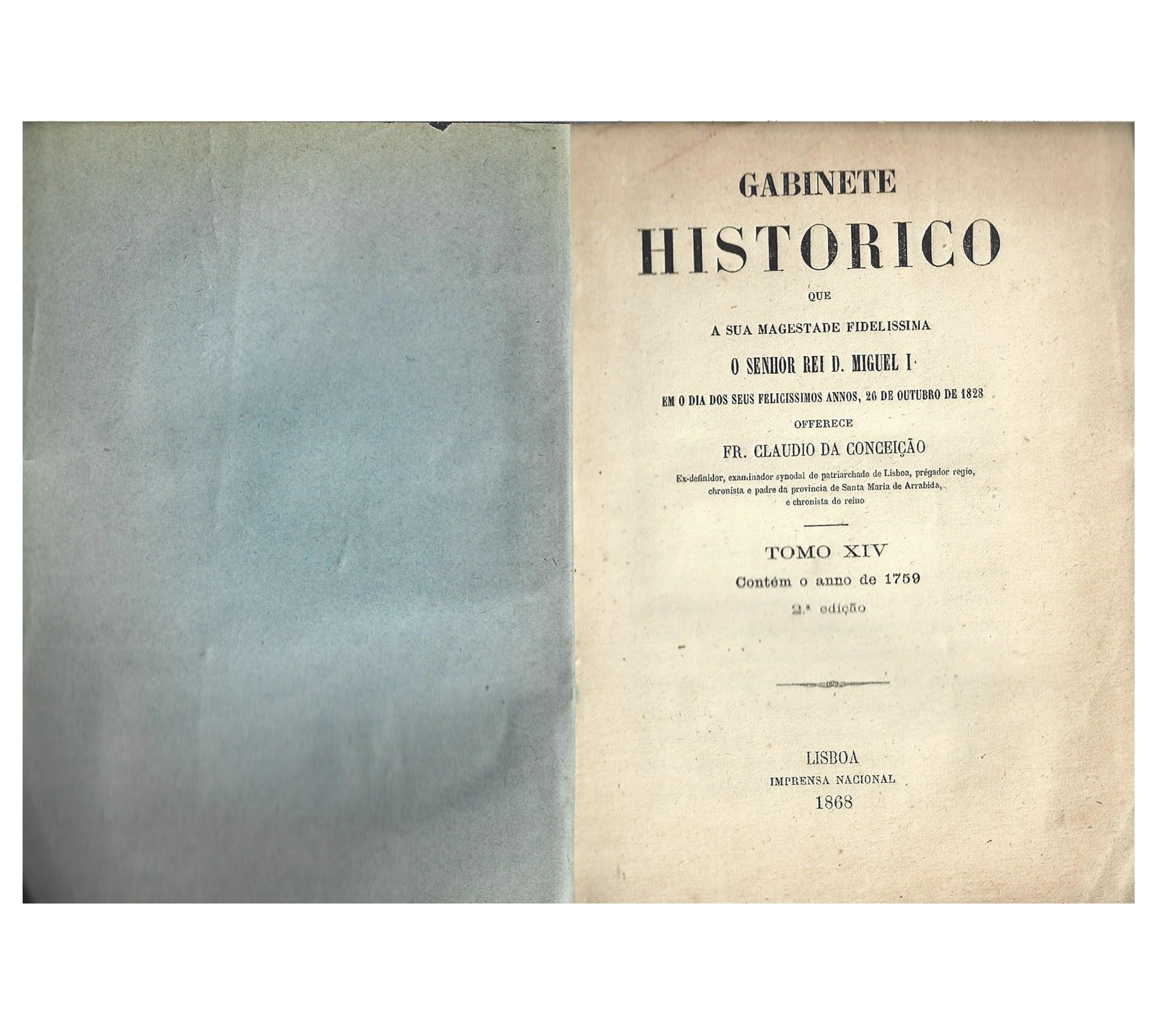 CONCEIÇÃO, FR. CLAUDIO (1868) GABINETE HISTORICO QUE A SUA MAGESTADE FIDELISSIMA O SENHOR REI D. MIGUEL I EM O DIA DOS SEUS FELICÍSSIMOS ANNOS 26 DE OUTUBRO DE 1828 OFFERECE FR. CLAUDIO DA CONCEIÇÃO, TOMO XIV. CONTÉM O ANO DE 1759. 2º EDIÇÃO. LISBOA: IMPRESSÃO RÉGIA. DE 16X12CM. COM 343 PÁGS. B