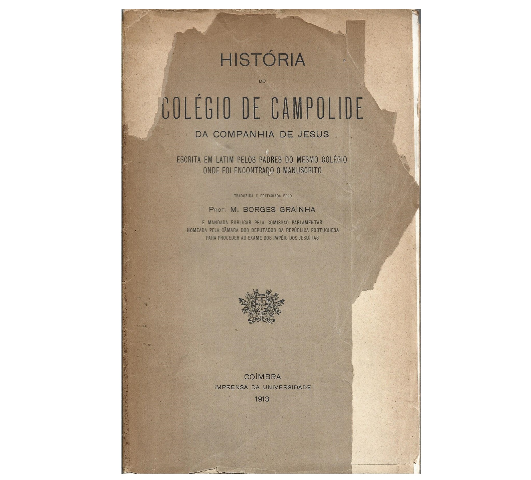 HISTÓRIA DO COLÉGIO DE CAMPOLIDE DA COMPANHIA DE JESUS, ESCRITA EM LATIM PELOS PADRES DO MESMO COLÉGIO ONDE FOI ENCONTRADO O MANUSCRITO; TRADUZIDA E PREFACIADA PELO PROF. M. BORGES GRAINHA E MANDADA PUBLICAR PELA COMISSÃO PARLAMENTAR NOMEADA PELA CAMARA DOS DEPUTADOS DA REPÚBLICA PORTUGUESA PARA PROCEDER AO EXAME DOS PAPÉIS DOS JESUÍTAS. PREFÁCIO DE MANUEL BORGES GRAINHA. COIMBRA: IMPRENSA DA UNIVERSIDADE, 1913. DE 22X14 CM. COM LXXVI, 148 – XI PÁGS. ILUST. B.