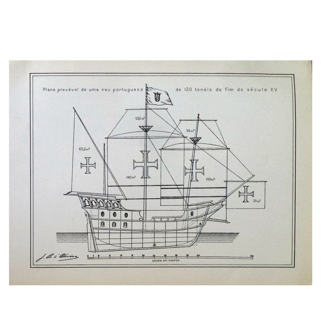 Ilustrado em extratexto com gravuras contendo os planos de arquitectura naval à escala, com a reconstrução da nau portuguesa do século XV de 120 tonéis de carga (840 litros cada tonel).