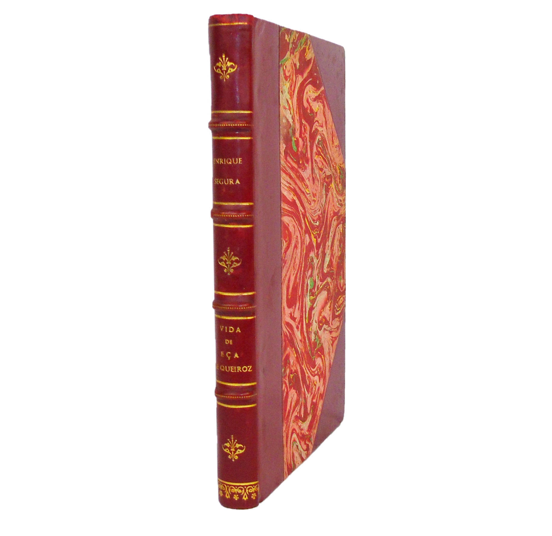 Interessante estudo biográfico com os seguintes capítulos: «Un niño encluenque»; «Coimbra»; «Actor cómico»; «Primeros pasos en Lisboa»; «La primera salida»; «Noches de Lisboa»; «Snobismo»; «Leiria»; «Las Conferencias del Casino»; «Las oposiciones a Cónsul»; «En La Habana»; «Su vida en Inglaterra»; «Amores de un solterón»; «El adiós! A la vida…de soltero»; «La boda»; «La vida de um escritor burguês»; «Por fin, Paris»; «Los Vencidos da Vida»; «Portugal en Neuilly»; «Se despide Portugal»; «Su muerte». Encadernação meia de pele com cantos, saída das oficinas de Vítor Santos, decorada na lombada com nervos e ferros a ouro; corte da cabeça carminado, única margem para o efeito aparada; capas preservadas. [miolo amarelecido; ex-líbris colado no verso da pasta anterior; corte das folhas frontal com acidez; leve desgaste na pele da lombada, mais notado à cabeça]